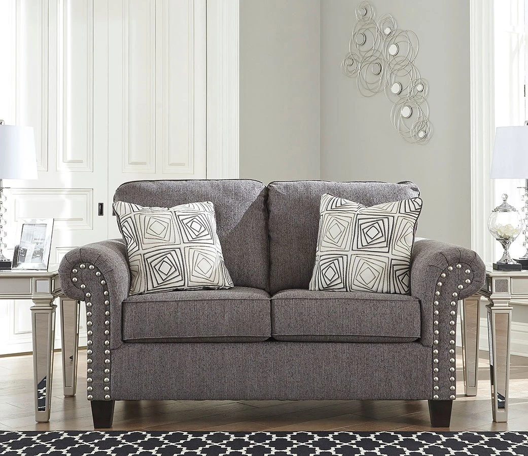 - OverviewA contemporary dream. The Agleno loveseat by BenchCraft checks off everything on your list. Designer profile is accentuated with roll arms and pewter-tone finished nailhead trim. Upholstered in a textured chenille, the feel is up to par with the look. Geometric throw pillows flaunt a mesmerizing pattern. Tapered accent legs finish off top-to-bottom style.