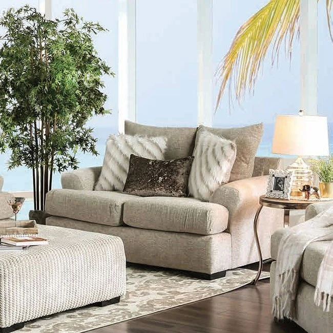 - OverviewThis beige upholstered Anthea Loveseat by Furniture of America is just the type of canvas you need for your room. The visual idea behind this loveseat is to give you something to decorate, the included throw pillows offer a texture difference and you can add blankets or a textile to bring even more colors and patterns to this piece.