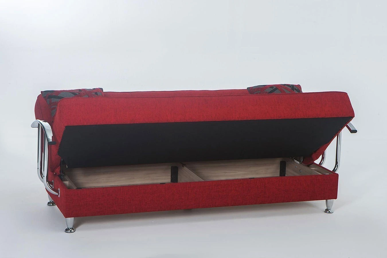 - OverviewThe perfectly modern yet extraordinarily cozy Betsy 3 Seat Sleeper (Story Red) from the Betsy Living Room Collection by Bellona Furniture in red chenille fabric has chrome arms and legs, a hidden storage compartment, innerspring construction, and absolutely inviting overall look.