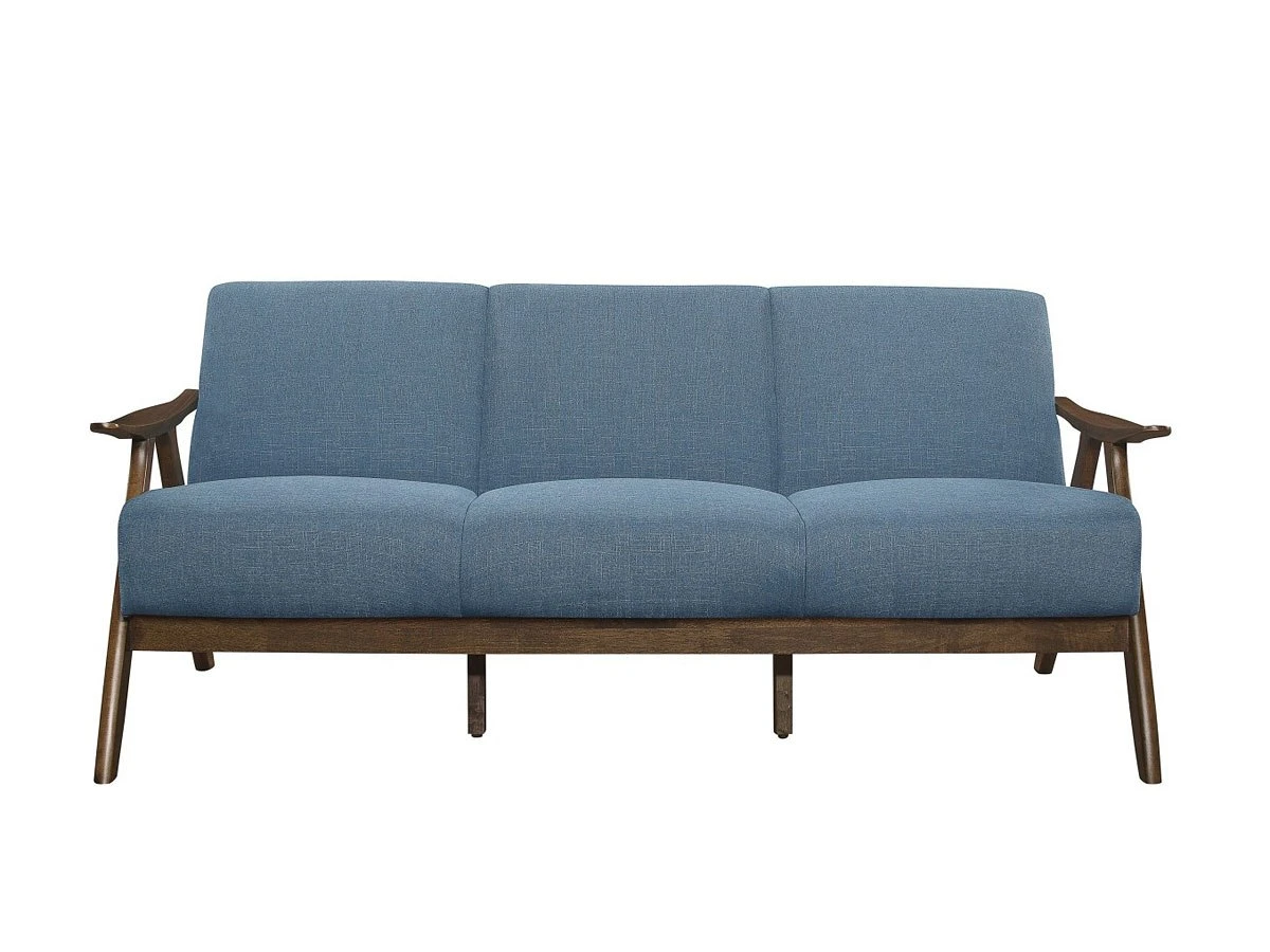 - OverviewThe retro-inspired wood framing of the Damala Living Room Collection by Homelegance will perfectly accent your modern home decor. Subtle contouring to the seating collection’s wood frame is finished in walnut, presenting as a classic complement to the blue fabric that covers the padded seats and backs of the sofa, loveseat and chair.