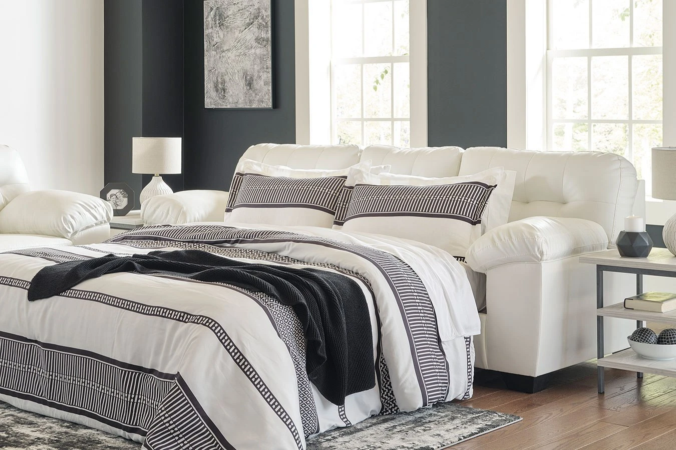 - OverviewDressed in glorious white faux leather, this Donlen queen sofa sleeper by Signature Design is certain to be the center of attention. With tasteful tufting, padded armrests and a sleek tapered design, it combines style and comfort. This sofa’s generous scale lets you kick back and relax at home solo or when hosting friends. What’s more, the pull-out queen mattress, made with quality memory foam, comfortably accommodates overnight guests.