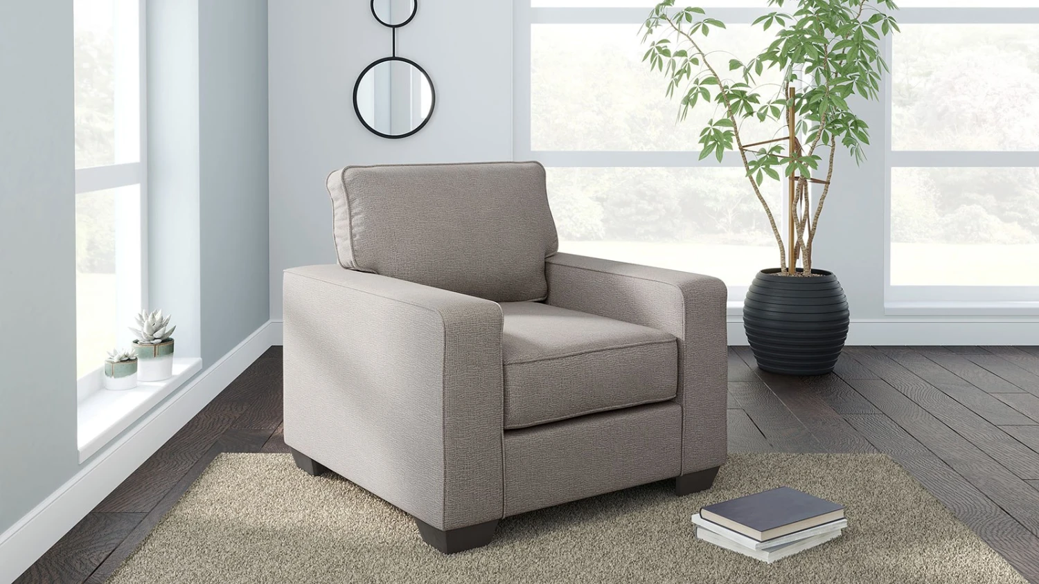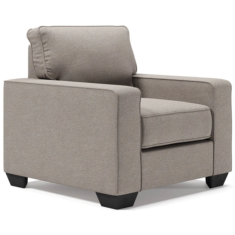 - OverviewMake your living space that much more livable with this Greaves arm chair by Signature Design. Rest assured that its ultra-neutral upholstery with a textural chenille feel goes with anything and everything. Wide track armrests, box cushions and tapered feet lend a clean, contemporary aesthetic. Make it even more enticing by pairing it with the available matching ottoman and reserve yourself the best seat in the house.