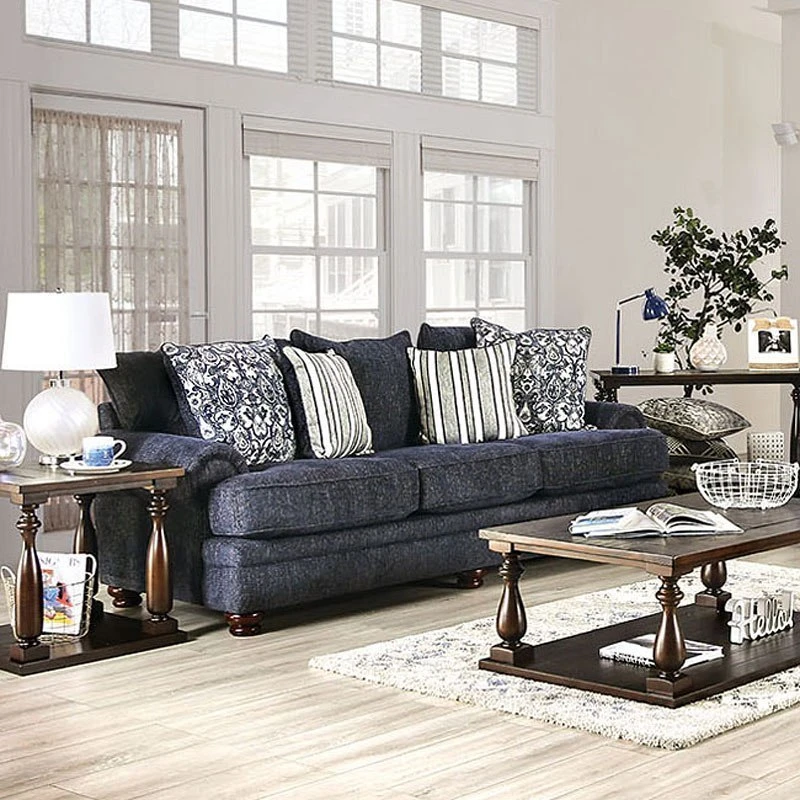- OverviewWith a unique knit concoction of deep, rich blues and grays and its subtle array of color variations, the overall theme of this Hadleigh Living Room Collection by Furniture of America hints at an elegant, almost Gothic affair with classic arms and polished vintage turnip wood feet. Comfort is ensured by way of overstuffed seat cushions and large pillow backs, accompanied by a variety of throw pillows that were added for texture and luxury.