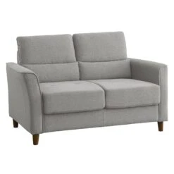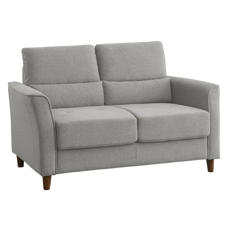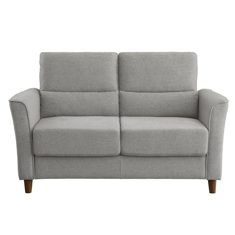 - OverviewThe refined elegance of the Hinshaw Collection’s design presents as modern offering for your living room. Gray fabric lends neutral accent to your space, while contour stitching, subtly flared track arms and contrasting wood support legs all lend to the classic style.
