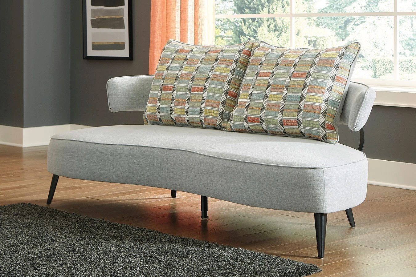 - OverviewCool takes a new shape in your living room with this Hollyann sofa by Signature Design. Rounding out your stylish, urban space, this piece sports a velvety soft upholstery and sleek, tapered legs. Curl up with comfort, and really turn around your home decor.