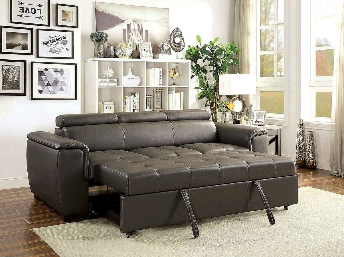 - OverviewThis elegant Holywell sofa by Furniture of America transforms into a pull-out sleeper with ease. Simply pull out the bottom platform and the supple faux leather cushions will fold out to accommodate overnight guests. Tastefully designed, this piece will grow along with your home and your modern style.