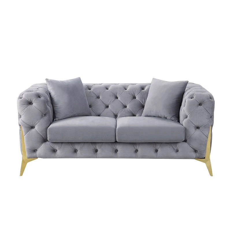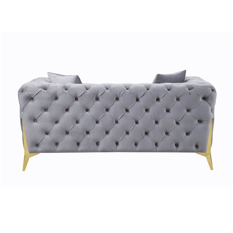 - OverviewThe Jelanea Living Room Collection by Acme Furniture is the ideal solution to reflect your regal tastes. The classic design ensures that the pieces offer timeless appeal. The velvet upholstery brings out the glamorous side of each piece, and the metal gold legs offer a contrast to the soft velvet. Exquisite details, such as button-tufted armrests and back elevate the design. The included accent pillows further add to the comfort level of each piece. Complete your living room with these regal seating options.