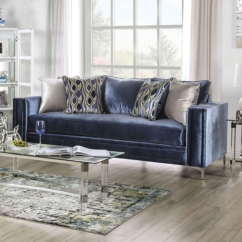 - OverviewThe dynamic vibe of blue satin emanates from this awesome looking Jodie Living Room Collection by Furniture of America that is completely American made! Includes matching pillows of surreal design!