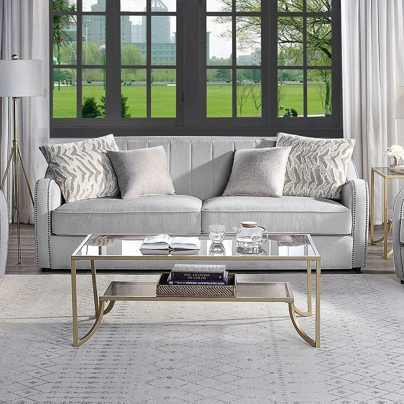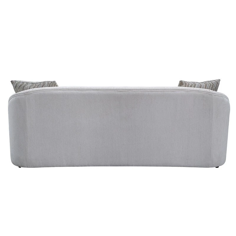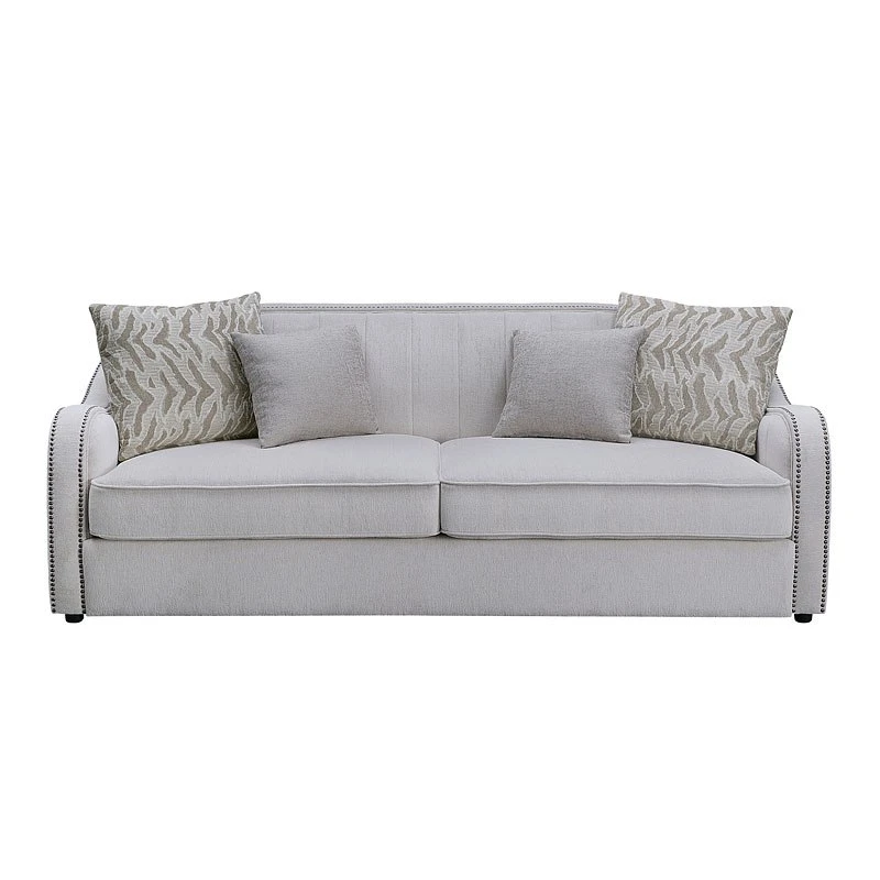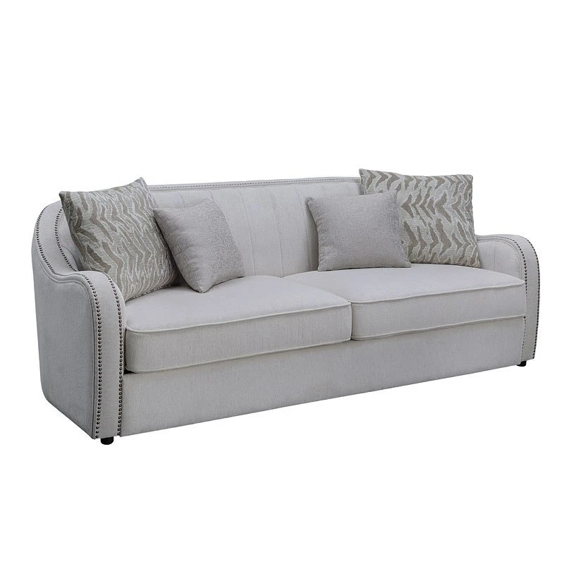 - OverviewCreate a clean, contemporary look with the gently curved Mahler Living Room Collection by Acme Furniture. The inner wooden frame and block plastic legs offer maximum support. Upholstered in a beige textured linen fabric and outlined with nailhead trim. The barrel seat and sloping armrests make for plush, modern depth that envelopes guests in comfort and style from all angles. The included accent pillows complement the collection beautifully and provide added comfort while lounging.