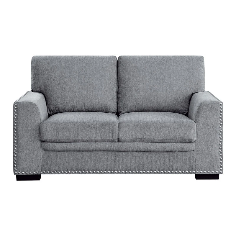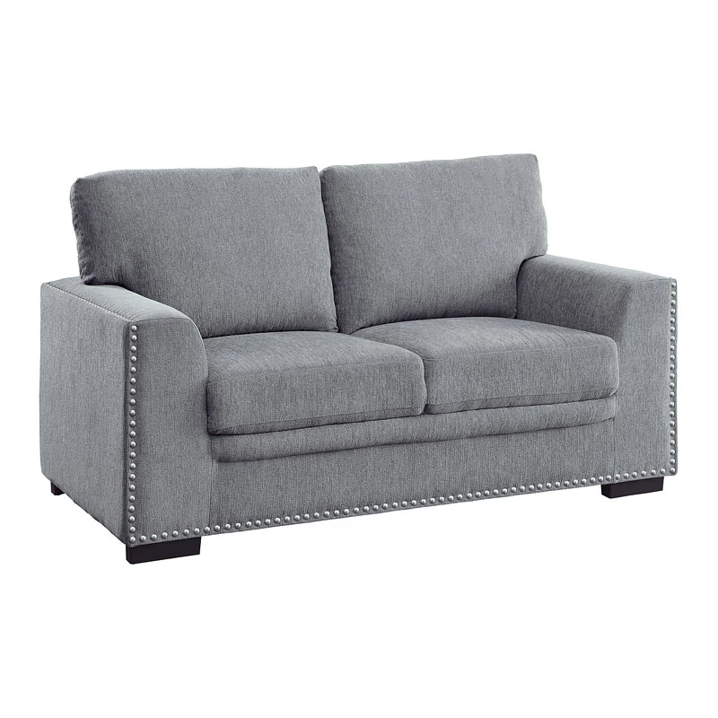 - OverviewA perfect addition to your casual living room, the Morelia Collection’s decoratively flexible style allows for placement in myriad living room settings. Covered in gray chenille, the profile of this loveseat is defined by its nailhead trim, loose back cushions and track-style arms, creating a look that is perfect for your home’s living room.