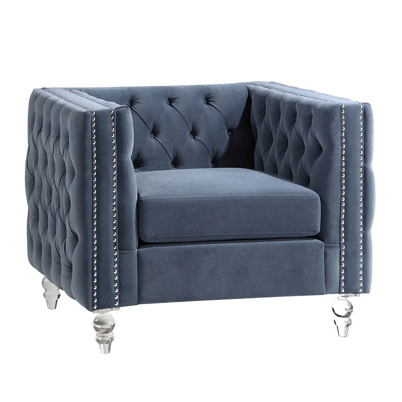 - OverviewGlamorous from top to bottom, the Orina Living Room Collection by Homelegance exemplifies the radiant styling that defines your personal style. From the nailhead accent, dark blue velvet button-tufted cover, down to the acrylic legs that support the sofa, loveseat and chair, each classic accent culminates to achieve the elegant aesthetic you desire for your home’s decor.