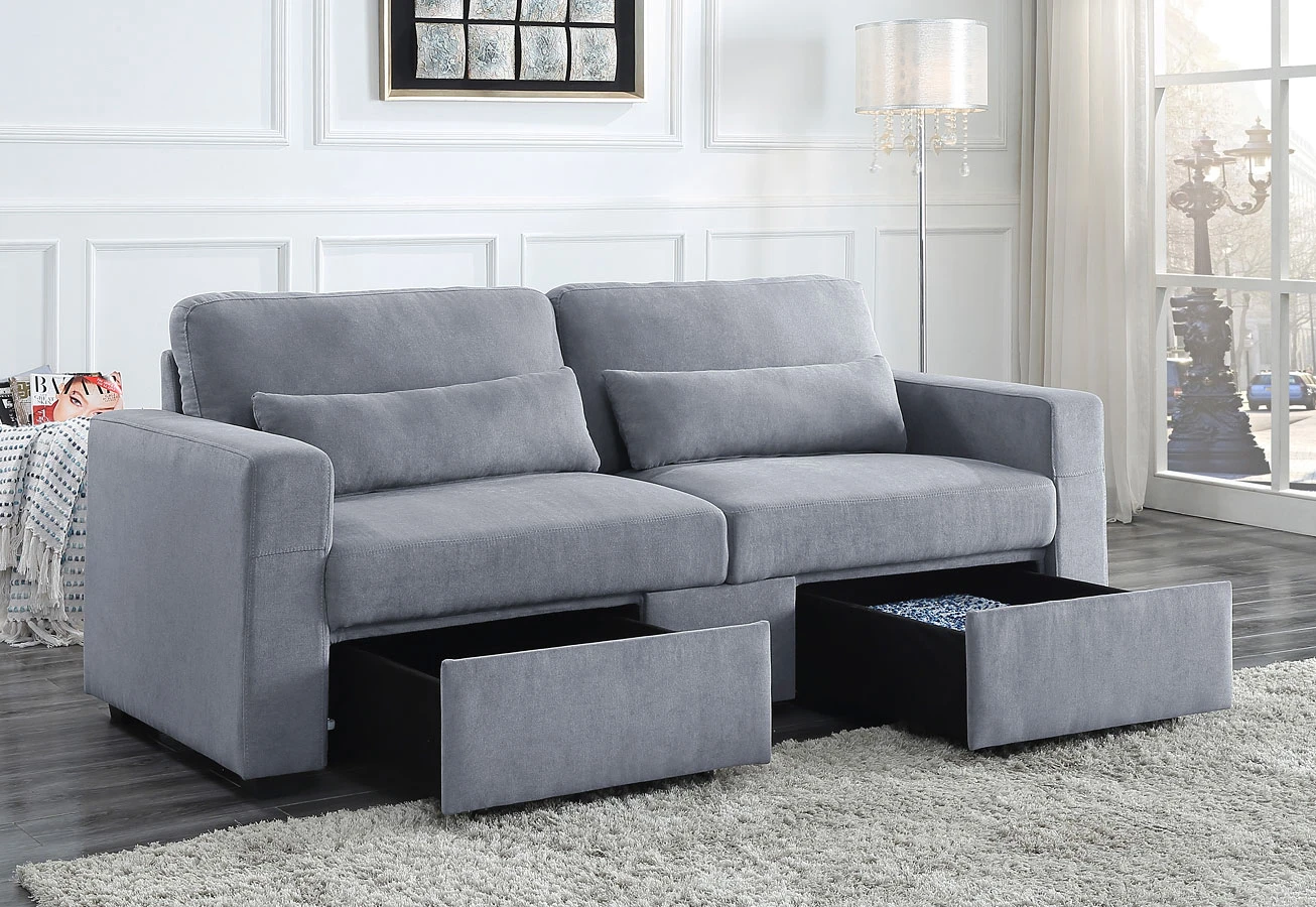 - OverviewMake the most out of your living room with the Rogyne Storage Sofa by Acme Furniture. This sofa is comfortable enough to lounge on for hours on end, and it also adds a storage function to your living room. The footrests are convenient storage drawers that can be used to store blankets and pillows. The track armrests help form a modern, clean-lined silhouette. It is upholstered in a neutral gray fabric that is easy to style around and fit into various aesthetics.