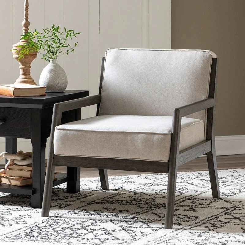- OverviewA light gray fabric pops against a wooden frame, and the result is a comfortable chair sure to blend with any style. The muted colors will compliment the brightest of rooms and add a pop to darker toned decor. 100% polyester fabric ensures lengthy conversations or book reading sessions in comfort.