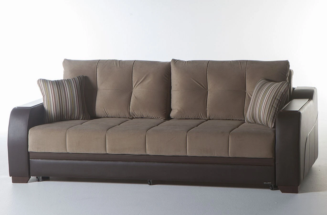 - OverviewThe Ultra 3 Seat Sleeper (Lilyum Vizon) from the Ultra Living Room Collection by Bellona Furniture is soft and inviting with tufted cushions and decorative contrasting pillows. Leatherette armrests with espresso-colored detailing help achieve a modern flair in the home.