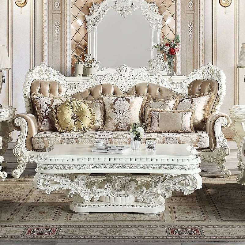 - OverviewOrnate and grand, the Vanaheim Living Room Collection by Acme Furniture is sure to leave everyone impressed. The collection features intricate moldings that are inspired by the Baroque era. The antique white finish is accentuated with gold. The bench-style seating is upholstered in a damask fabric to accentuate the Baroque styling. The backrest is tufted with crystal-like buttons for a regal touch.